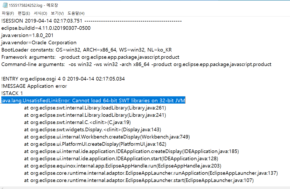 파일을 열어보면 나의 경우는 64bit eclipse 를 32bit jvm 에서 실행 시킨 것이 문제였다.