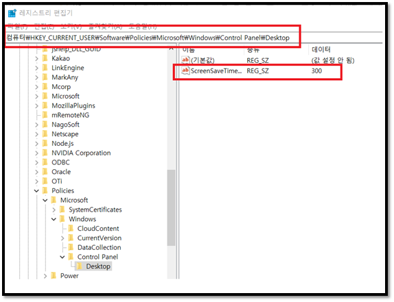 에 ScreenSaveTime 의 값을 300 (단위는 초임)