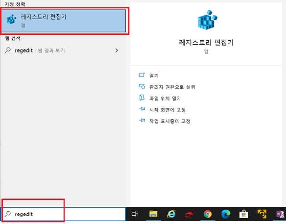 1. 검색 창에서 regedit 으로 레지스트리 편집기 창을 염