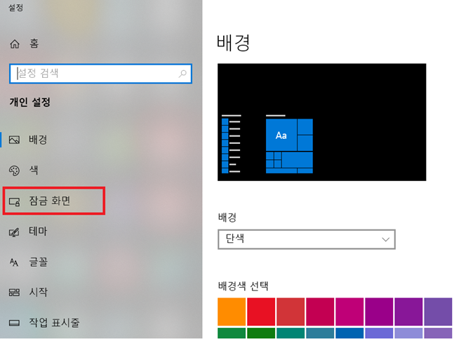 2. 오른쪽 메뉴에서 잠금 화면 클릭