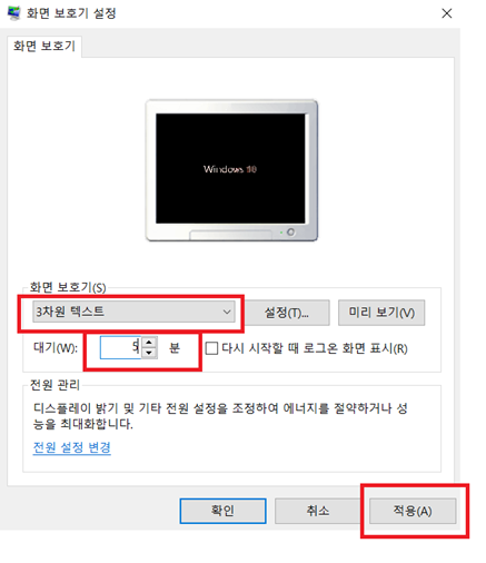 4. 화면 보호기 이미지 선택 및 시간 정하고 적용 버튼 클릭