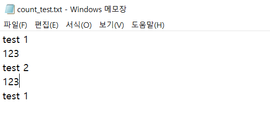 (type 은 리눅스의 cat 으로 생각하시면 됩니다. count_test.txt 파일 내용을 출력 하는 것입니다.)