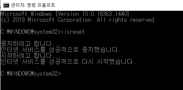 5. cmd 창을 관리자 권한으로 연 다음 iisreset 명령어로 iis 재기동을 해줍니다.