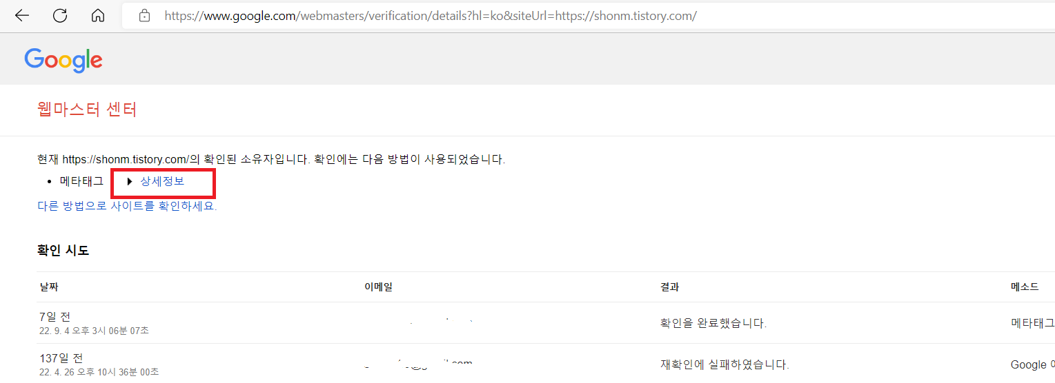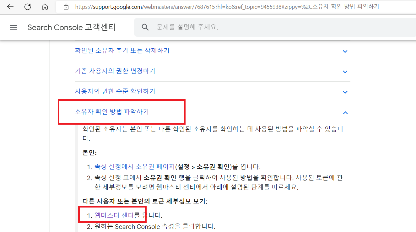 4. 소유자 확인 방법 파악하기 > 웹마스터 링크 클릭