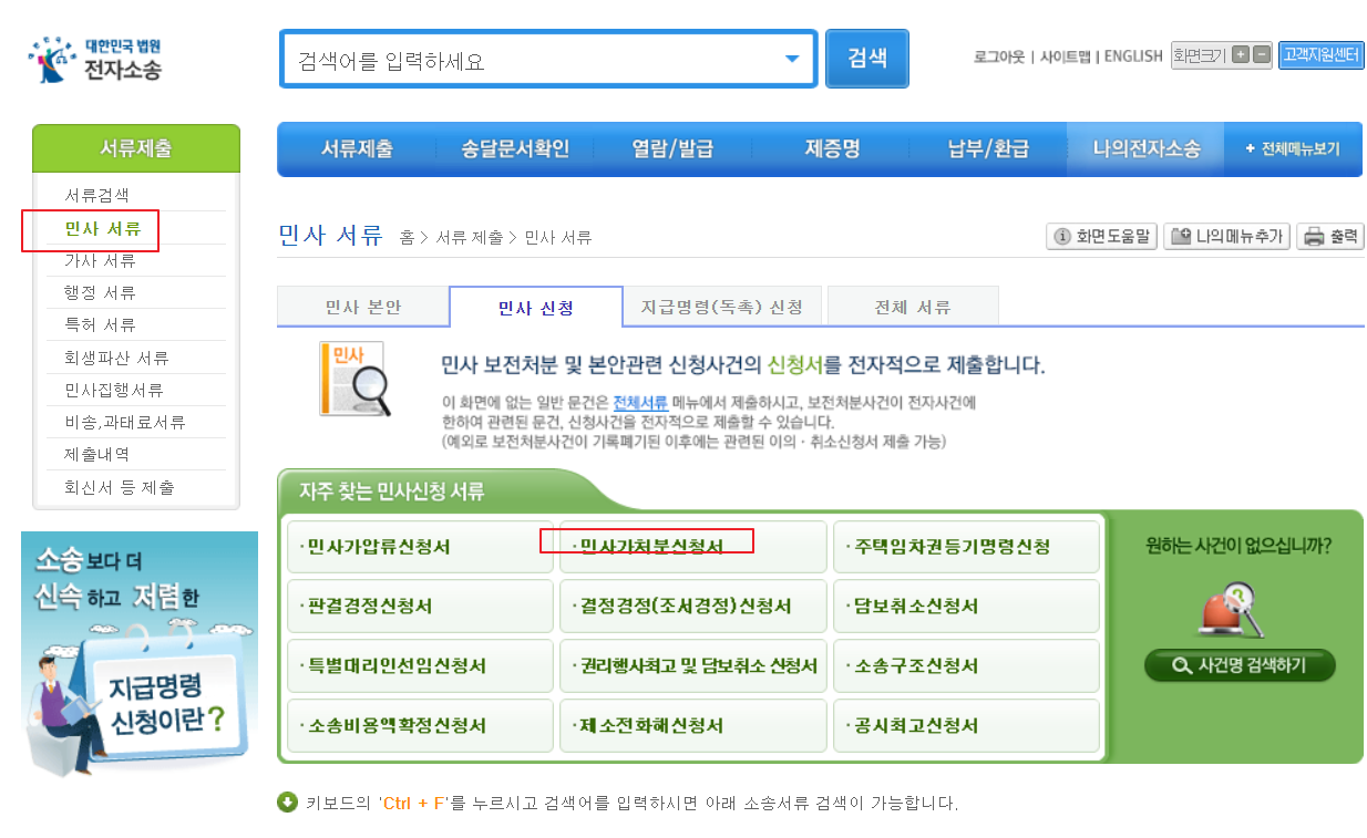 서류제출 > 민사 서류 > 민사가처분신청서 순으로 클릭